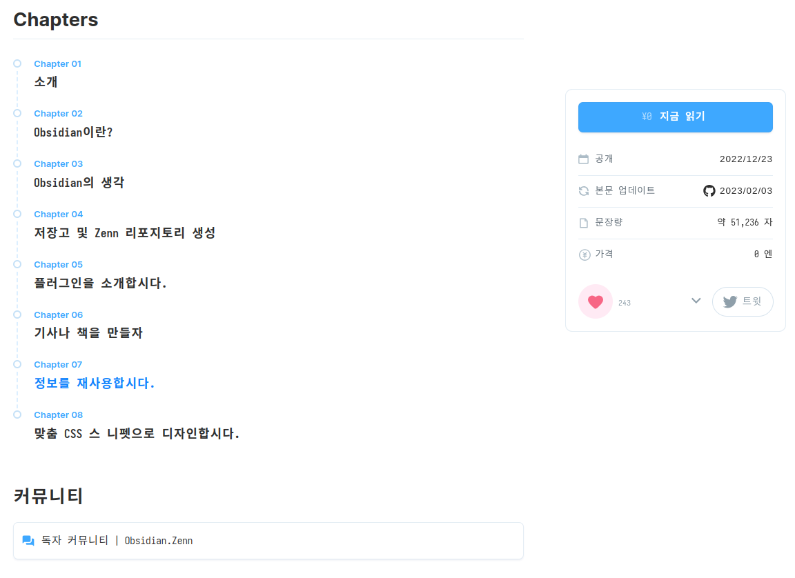 무료 책이라 좋다. 구성을 보면 저장소 생성이 있다. 이게 핵심이 아닌가? 그리고 커뮤니티를 보라. 스크랩일 뿐이다. 여튼 여기에 독자 커뮤니티가 생성 된 것이다. 깔끔하다.