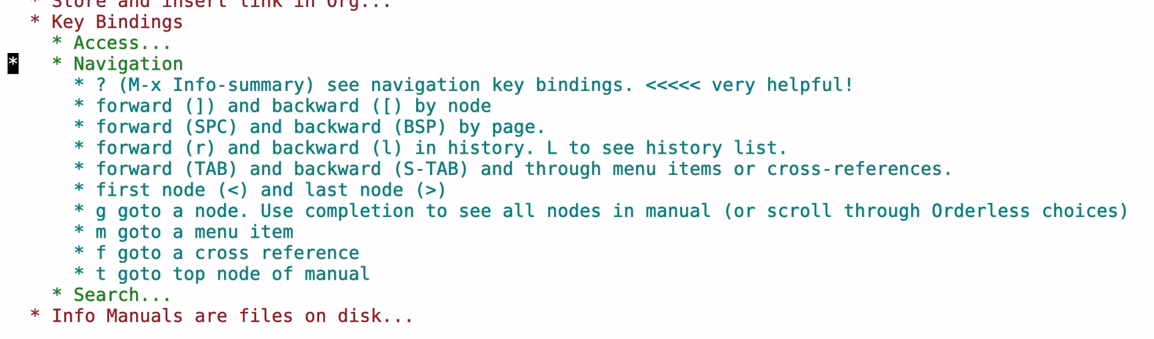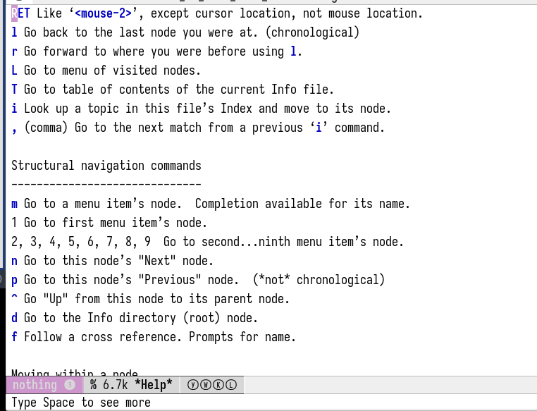 INFO 모드라고 있다. 로컬에 모든 메뉴얼이 있단다. 인터넷 접속할 필요도 없다. 근데 INFO 파일을 열면 어떻게 보는지 알 수가 없다. 확 열이 받는다. 영어인데 키바인딩은 뭔가?!