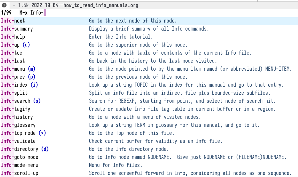 자연스럽게 할 수 있는 일은 M-x 로 Info 들을 보는 것이다. 위에 보면 인포로 시작하는 함수들이 있다. 키 바인딩 되어 있는 몇개가 있고 없는 것이 대부분이다. 메뉴얼은 메뉴얼일 뿐 현재 시스템에 어떻게 매칭되어 있는지가 핵심이니 한번 호출해서 동작하는지 본다. 그리고 키맵을 만든다.