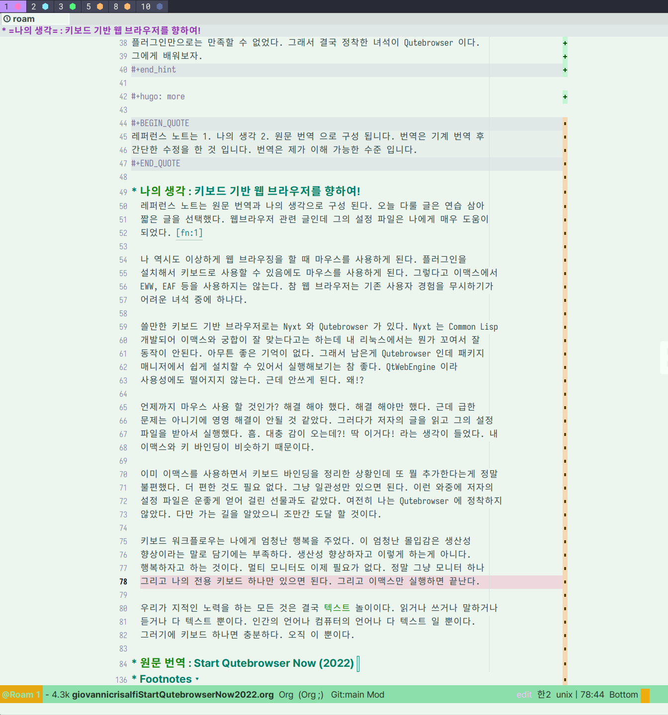 이미 이맥스를 사용하면서 키보드 바인딩을 정리한 상황인데 또 뭘 추가한다는게 정말 불편했다. 더 편한 것도 필요 없다. 그냥 일관성만 있으면 된다. 이런 와중에 저자의 설정 파일은 운좋게 얻어 걸린 선물과도 같았다. 여전히 나는 Qutebrowser 에 정착하지 않았다. 다만 가는 길을 알았으니 조만간 도달 할 것이다.