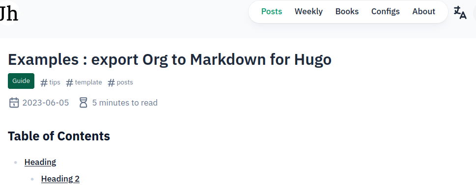 Org-mode 에서 작성한 문서를 Hugo Markdown 으로 변환하기는 쉽다. 근데 각주, 인용, 태그, 요약, 코드, 일부 내용 감추기 등을 어떻게 하는가? 여기에 대한 답을 찾는다. ox-hugo 의 모든 예제는 다음 주소에 있다. 여기서 찾아보자. 1