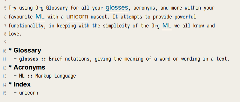 Org Glossary 는 모든 ox-* 백엔드에 대해 정의된 용어의 버퍼 내 강조 표시 및 높은 품질의 내보내기를 지원하여 Org 문서 내에서 glossary-like 구조 (용어집, 두 문자어, 색인 등)로 작업하기 위한 유연한 모델을 정의합니다.