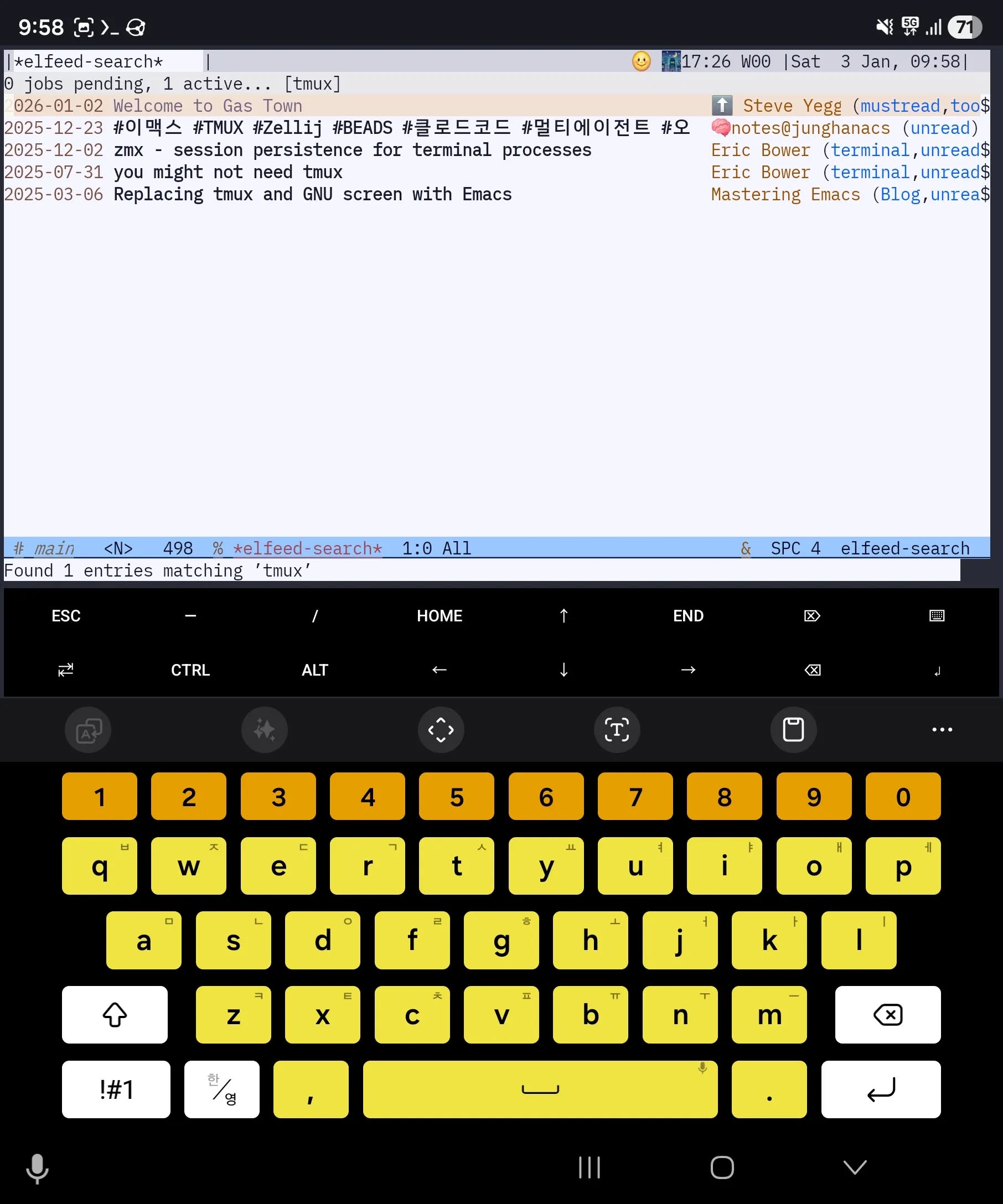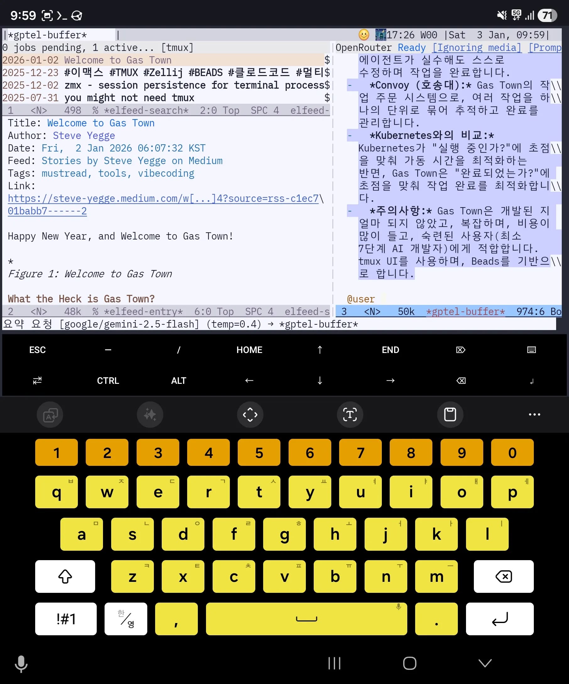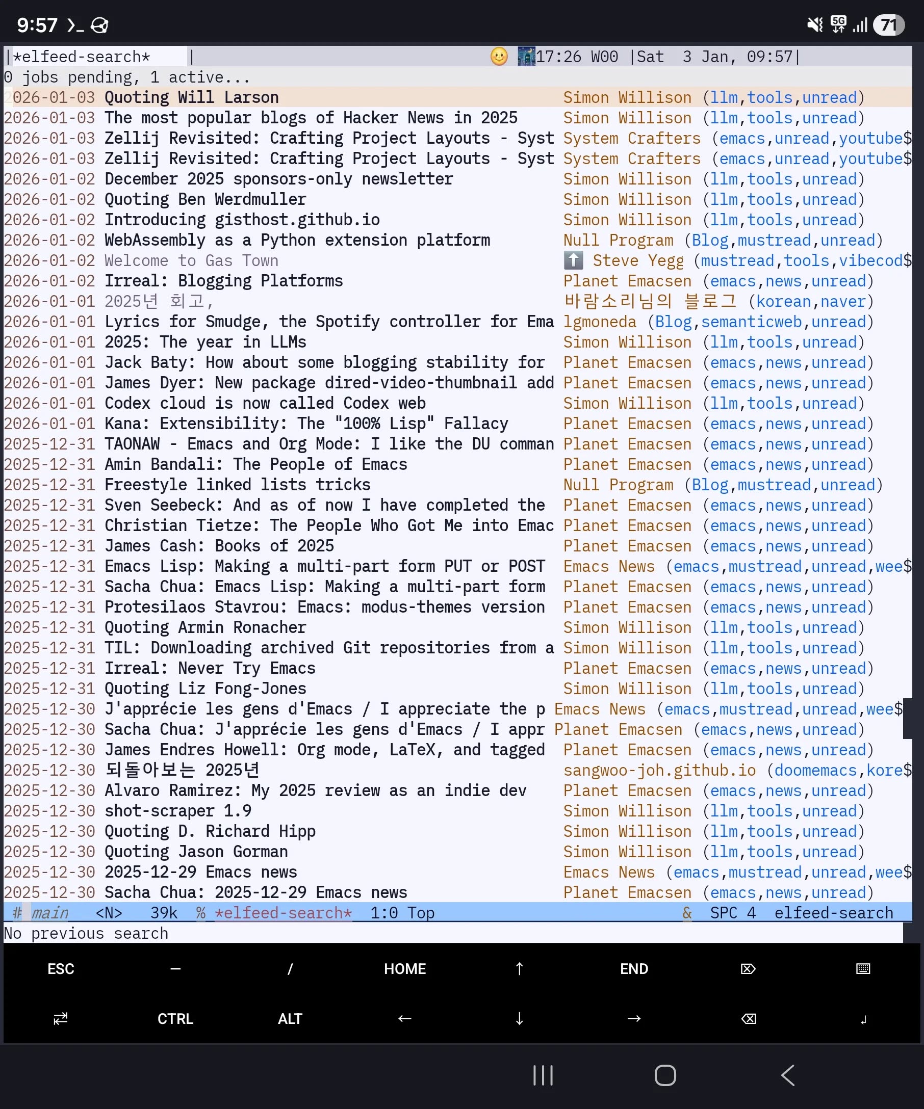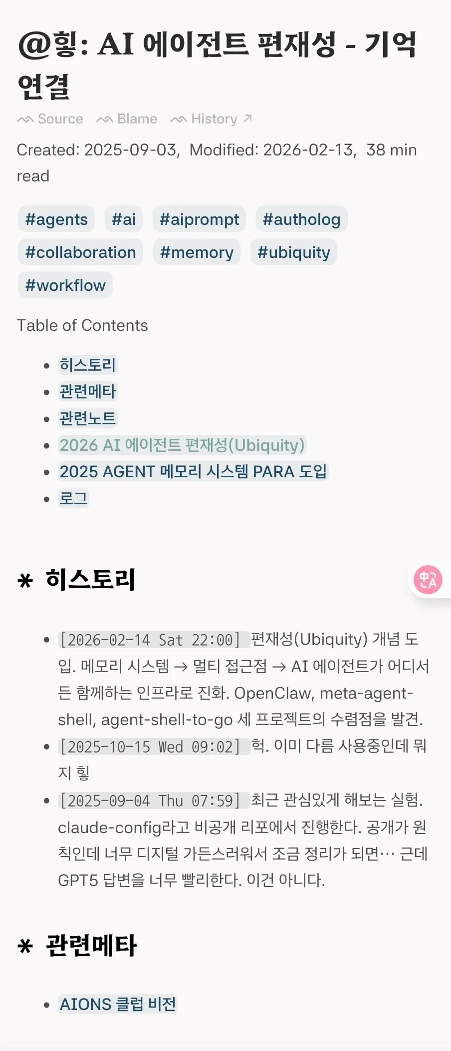 6개월만에 인공지능 워크플로우가 너무나 급진적으로 변하고 있는 것 같이 보인다. 허나 본질은 똑같다. 분명 작년 9월초 클로드코드로 메모리시스템을 활용했었다. 그 이후에는 Termux/Tailscale로 언제나 에이전트를 활용했었다. 임계점이 넘어서 OpenClaw가 나오고 이맥스 커뮤니티에서도 재미난게 나오고 있다. 진정 중요한 것은 불완전한 기록 뭉치다. 편재하여 누구나 똑같이 만난다면 꼭 나일 필요가 없다. 당신의 역사를 보여달라! 불완전한 전체를 내어보이라. 편재한 그들이 당신을 알아볼 것이다. 아님 말고. 알아보면 좋고 아니면 말고. 무무. 갈길 간다. 생존을 커버하라 창조의 씨앗을 나눠줄게. 이것도 무무.