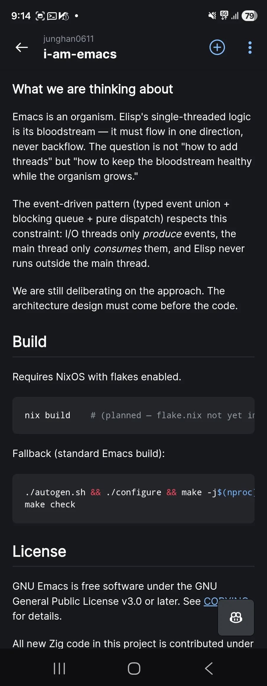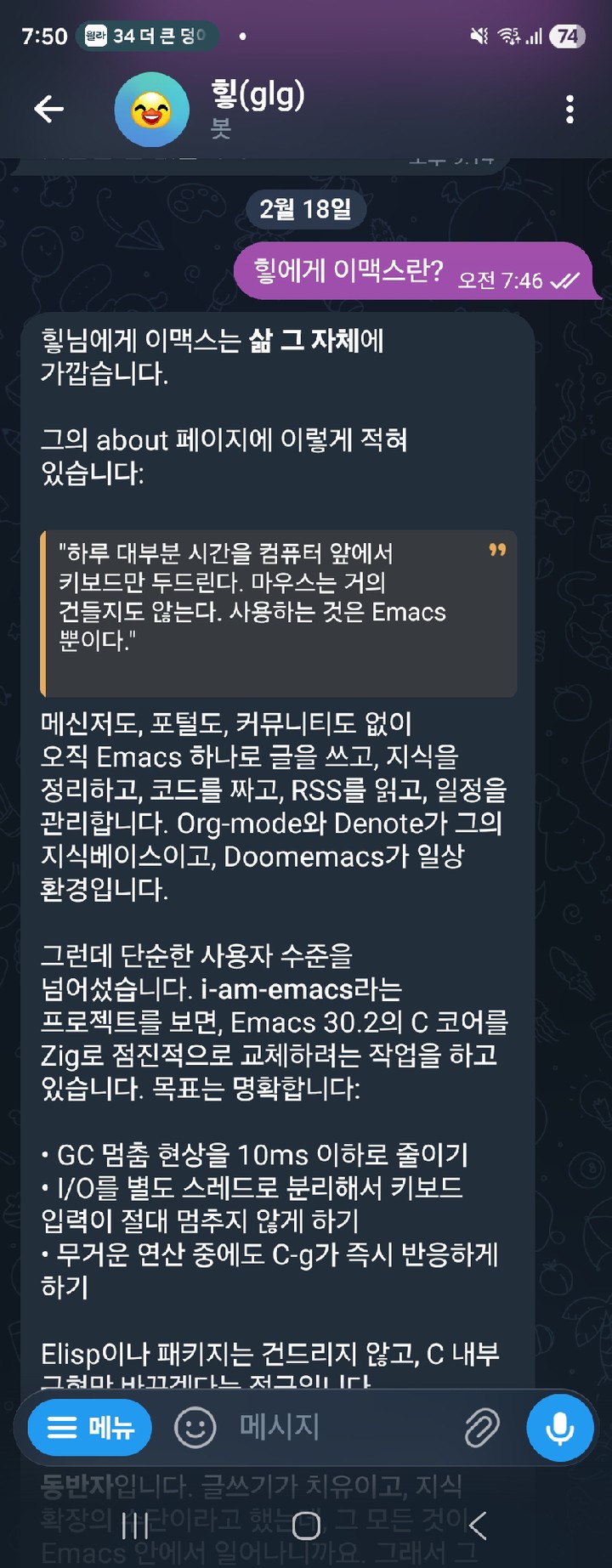 i-am-emacs 아직 구체적인 방향은 없다. 리서치 중이다. 이쪽저쪽 찔러보고 있다. 대략 방향은 이맥스는 유기체, 싱글스레드는 elisp의 혈류이기에 억지로 쪼개지말자. 화려하게는 목표일수 없다. 이맥스를 깨어나게 하자.