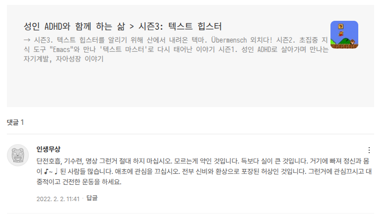 그냥 키보드로 숨참기 힘들다고 글을 썼다. 어디에? 티스토리에 말이다. 그러다가 한 댓글을 만났다. 한참 감사일기도 쓰고 단전호흡도 한다고 몇 초 숨참는지 글도 쓰고 했다. (@힣: #성인ADHD 블로그 #시즌3)